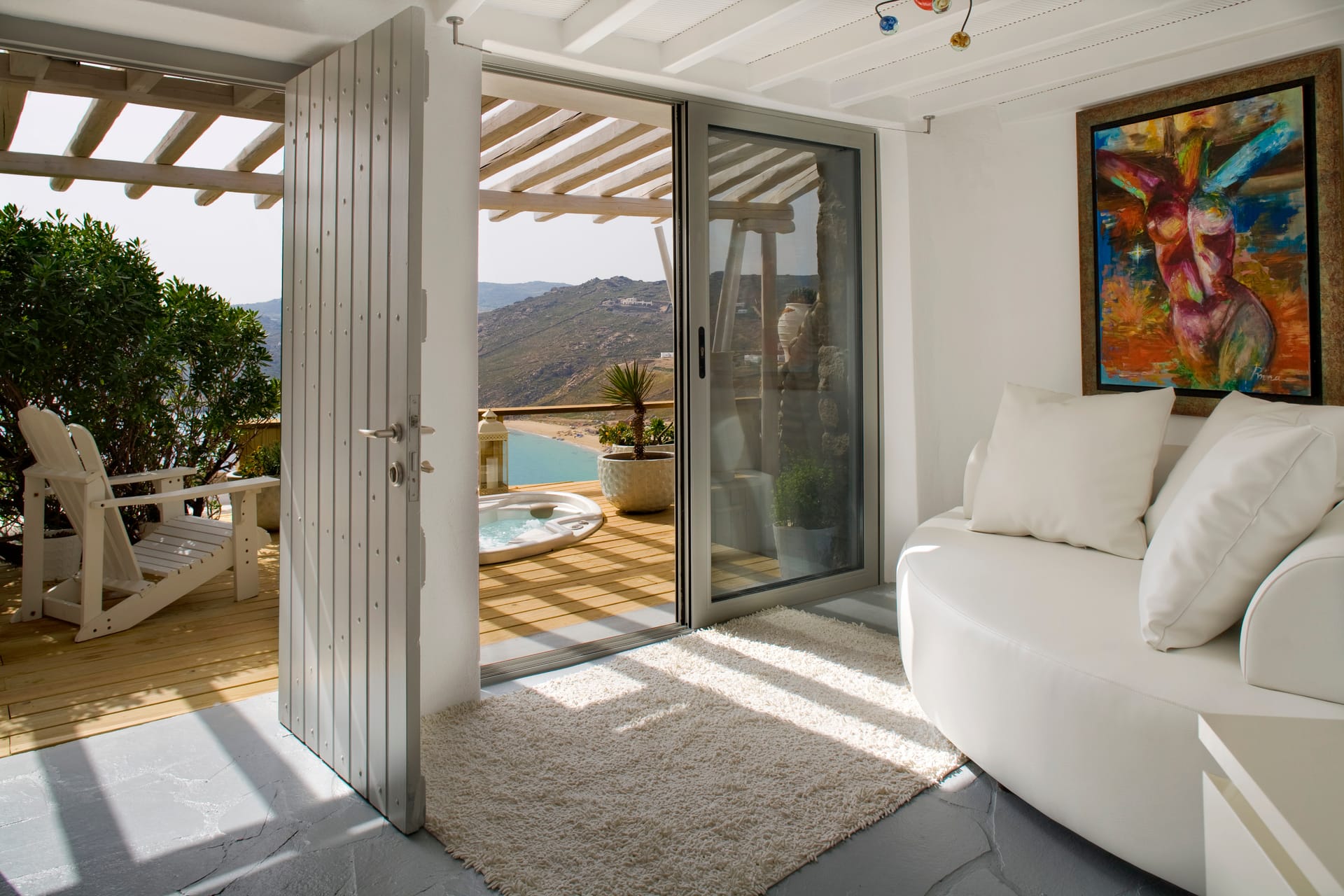 Privacy and independence of a private home with the comforts and exclusivity of a luxury hotel. With an outdoor jetted tub ,a queen size bed and a balcony overlooking Elia Bay .